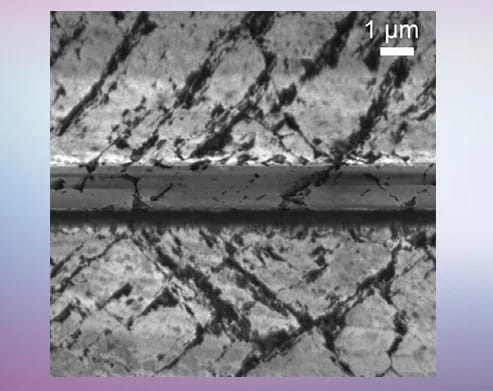 Scanning electron microscopy image of (top to bottom) the epilayer, damaged substrate, graphitic layer, and substrate. Image from the Zhang lab at Rice.